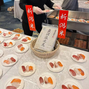 こちらのレセプションでも新潟米プロモーションの一環として、レセプションの料理として提供したお寿司に新潟米を使用していただきました。こちらも参加した方から大変好評をいただいたほか、調理を担当した公邸料理人の方からも中国での仕入先に関するお問い合わせをいただくなど、良い新潟米のPRの機会となりました。