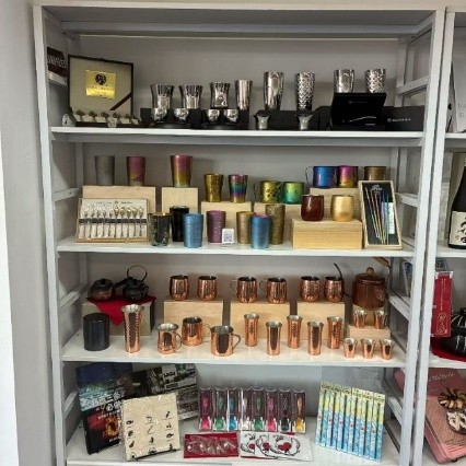 「新潟の工芸品」コーナーでは燕三条エリアの県内企業製品のタンブラーやカトラリーなどを展示しており、一部の製品は現地のECサイトからも購入できるQRコードも併せて配置しています。