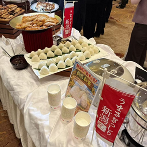 今回のレセプションでは新潟米のPRのため、当事務所から10kgの2025年度産新潟米を提供し、笹川流れの塩とともに「塩にぎり」として提供しました。参加者からは「いつも食べているお米と全然違う」「普段は冷たい食べ物は好まないが、このおにぎりなら冷めても美味しい」など大好評でした。用意したおにぎりは開始1時間も経たずに品切れとなるなど、新潟米の魅力を知っていただく良い機会となりました。